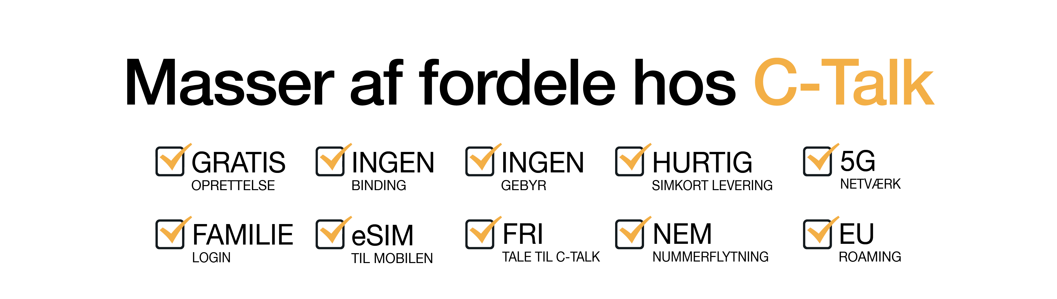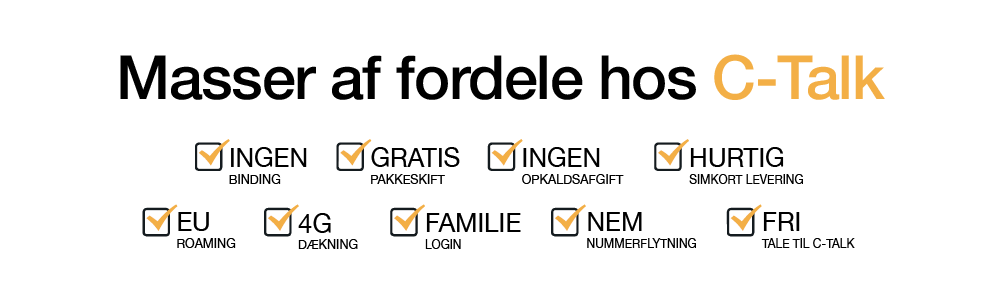 Hos C-TALK har vi et stort udvalg af mobilabonnementer med masser af fordele. Du får adgang til 4G og 5G netværket, ingen binding, ingen gebyr, ingen opkaldsafgift og fri tale til C-TALK. Ændre dit forbrug sig, kan du altid skifte gratis imellem vores mobilabonnementer ved at logge ind på "Min Side".